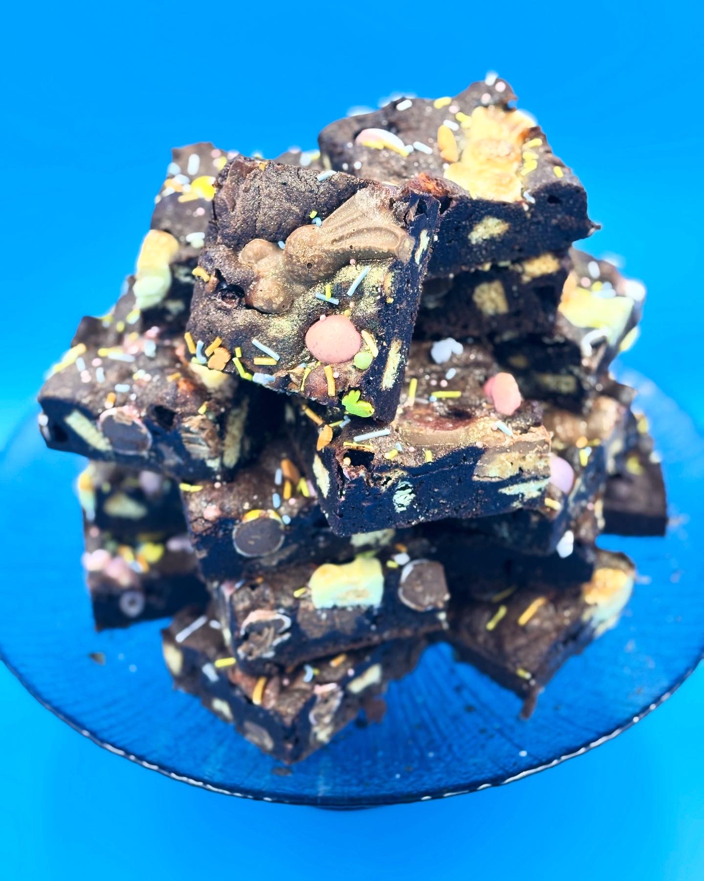 A fudgy chocolate brownie packed with squishy marshmallows, crunchy biscuit chunks, and colourful mini eggs—all topped with cheeky little Malteser bunnies.