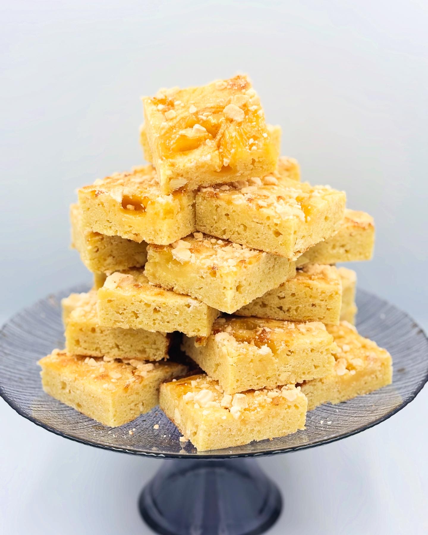 Warm cinnamon and apple filling nestled in an oaty blondie base, topped with a dusting of cinnamon sugar – a comforting hug in blondie form.