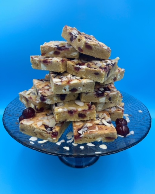 Everything you love about a Bakewell tart, baked into a blondie! A rich almond frangipane base, raspberry swirl, juicy cherry chunks, and a sprinkle of almond flakes—this blondie bakes well!