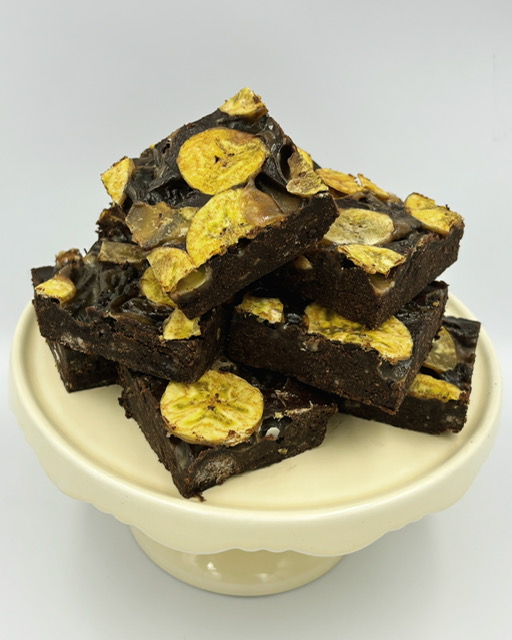A caramelised banana brownie with a creamy caramel swirl, topped with crispy banana pieces – this vegan and gluten-free delight is the perfect balance of rich, sweet, and indulgent flavours.