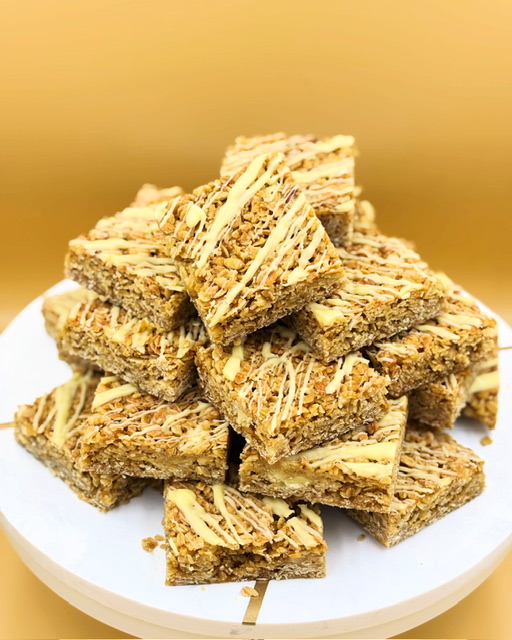 Ingredients: Golden Syrup, Light Brown Sugar, Rolled Oats, Flora Butter Alternative [Plant Oils (Sunflower, Rapeseed in varying proportions), Coconut Oil, Water, FABA Bean Preparation, Emulsifier (Sunflower Lecithin), Natural Flavouring, Colour (Carotenes)] Free-From White Chocolate Buttons [Sugar, Cocoa Butter, Inulin, Maltodextrin, Maize Flour, Coconut Oil, Emulsifier (Soya Lecithins), Flavourings.]