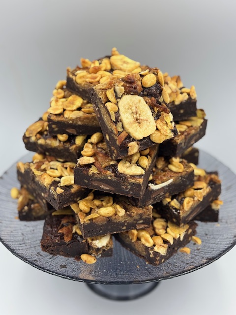 This fudgy vegan brownie is packed with the rich flavours of creamy peanut butter and ripe banana, creating the perfect balance of sweet and savoury. Topped with crunchy peanuts for an extra satisfying bite. You’ll be… going bananas for them!